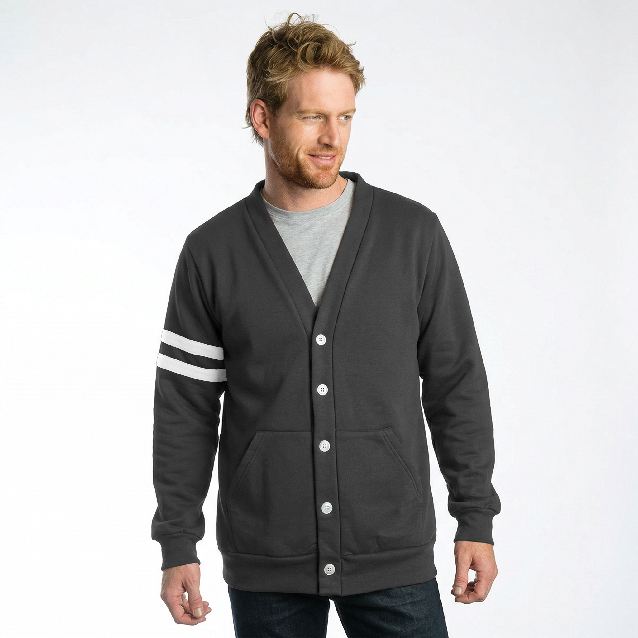 5 Button Cardigan with left sleeve stripes Available in Many Colours Available in Mens and Ladies